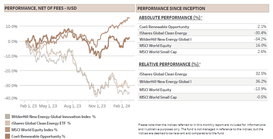 The Coeli Renewable Opportunities fund gained 6.2% net of fees and expenses in February (I USD share class). It is down 1.1% this year and up 2.1% since the inception on February 6, 2023.