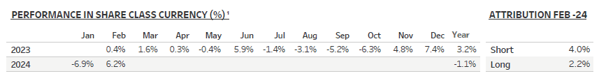 The fund delivered positive performance on both the long and short side in February, gaining 2.2% and 4.0%, respectively. The main reasons for the strong absolute and relative performance were good stock picking and positioning into earnings season. The hit ratio on long positions trading up post earnings and shorts going down was almost two-to-one versus losses on longs and shorts going higher. The stand-out name was Chart Industries (GTLS), our largest position, which added 13% on the earnings day. As expected, the company reduced 2024 EBITDA guidance slightly, but this was already in the price, and the stock is up 35% since the bottom in January.