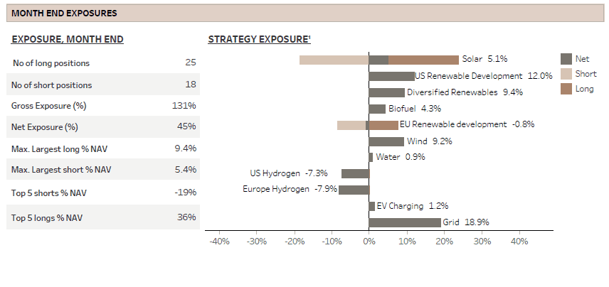 The second-best performing theme was “European Hydrogen”, which contributed 1.9% to NAV. The theme consists of short positions in European based hydrogen companies which as a group are continuing to disappoint on order intake and therefore revenue visibility. The biggest input factor by far in the production of green hydrogen is electricity. Three-four years ago, there was a hope that it would be possible to produce renewable energy at such a low price that limited subsidies would be required to make green hydrogen competitive with grey hydrogen derived from natural gas. However, this has not played out, at least not yet, and it is increasingly obvious that it will be more cost efficient, and better for the climate in most cases, to use green electricity directly instead of taking the inefficient route around hydrogen. Also, to qualify for subsidies, requirements to clean energy used in hydrogen production have become stricter than expected in both the US and the EU. This has caused many developers to postpone projects at best, and at worst cancel. We continue to be skeptical to this space.