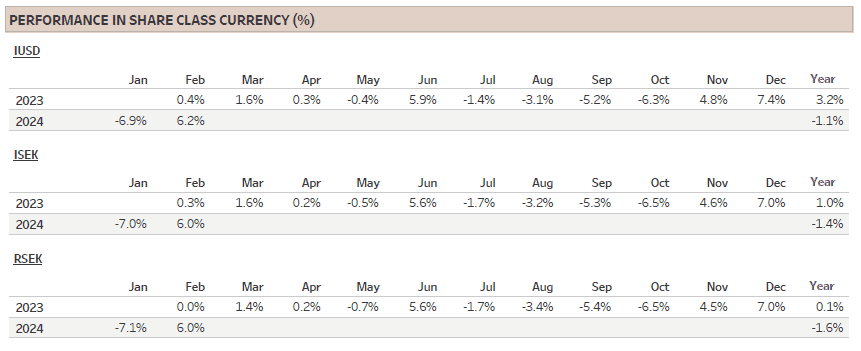 | Investment management fee (share class I SEK) | 1.00% p.a + 20% Performance fee (OMRX T-Bill Index) |