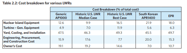 However, a 2018 study by the Massachusetts Institute of Technology (MIT) sheds light on a critical aspect: the nuclear island, comprising the reactor pressure vessel, piping, steam generator etc, accounts for merely 13% of a nuclear power plant's capital cost (AP1000 reactor). The bulk of the expenses are tied up in the yard, cooling, and installation work. This could imply that a shift to numerous smaller reactors might inadvertently hike overall costs due to the proliferation of facilities and more yard work. See below for MIT’s overview of common reactor designs and costs breakdown.