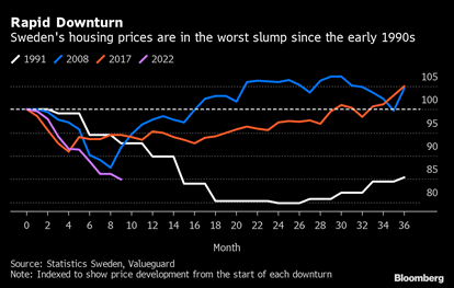 Swedish real estate prices are so far maintaining the same rate of decline as during the 2008 financial crisis (purple line). This time the Riksbank will not lower rates but, on the contrary, will raise them further.