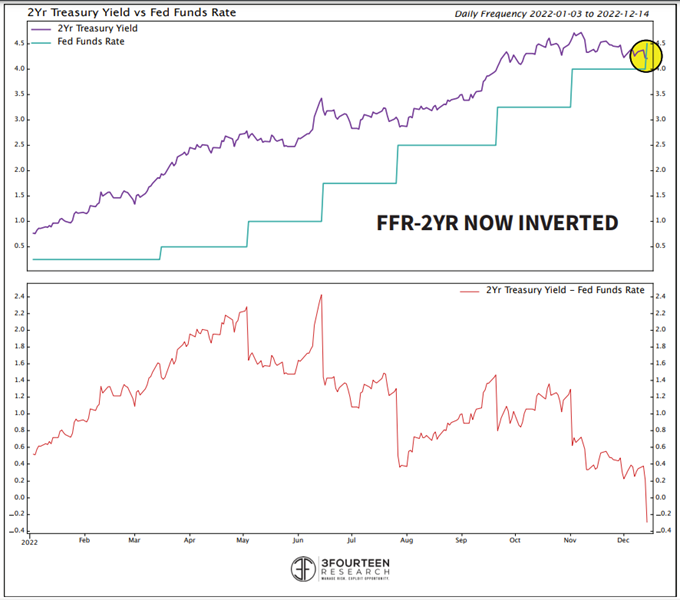 The US two-year interest rate has fallen recently and is now below the Fed's policy rate. Historically, this has signalled a shift in the FED's policy, which in turn has been positive for both bonds and stocks.