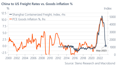The figure below shows the correlation between a Chinese freight index and US commodity inflation. If the correlation turns out to be positive, inflation will be down around zero percent in May.