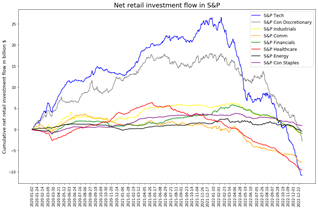 American private investors as a collective are the largest owners of American stocks. Since the spring of 2022, they have sold enormous amounts of technology shares (blue line) and, according to Goldman Sachs, have now net sold everything they bought since covid broke out almost three years ago. When does it turn?