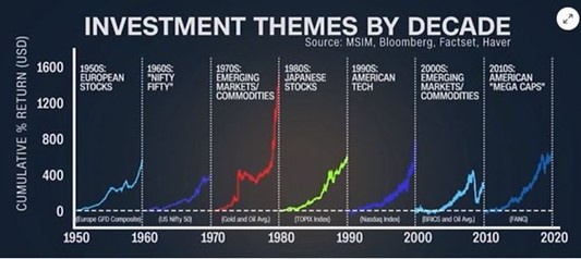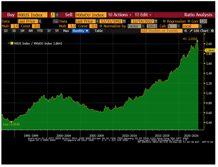 US stocks relative to global stocks since the early 1990s. Note the decline on the far right of the graph. Something happened at the end of 2022.