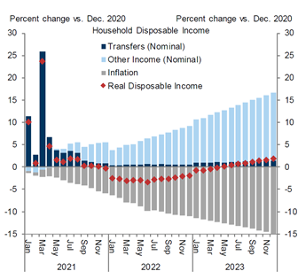 But after sun comes rain! Below Goldman Sachs estimates for the development of disposable income for the average American. Falling inflation, increased contributions and falling interest rates mean that the situation is expected to improve after the summer. For Europe, the big problem is energy costs, but Europe's politicians are likely to routinely increase national debt and give subsidies to appease their voters.
