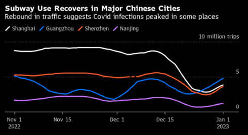 President Xi Jinping conceded defeat to Covid-19 after violent protests among citizens, and after a huge U-turn by Chinese leaders, society quickly opened up in December. It was all very unusual for China and suddenly Chinese could start traveling again. On the first two planes that arrived at Malpensa in Milan, 50 percent were infected and a certain feeling of déjà vu crept in. The image below shows that traffic in some major Chinese cities increased in the last week of December. The continued development here will have a major impact on global growth after almost three years of lock downs (to varying degrees).