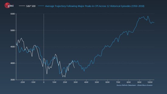 Historical data from 1950-2018, but zoomed in on a weekly basis, shows how the stock market in the US developed after inflation reached its highest level (0 on the x-axis). It doesn't necessarily have to be that way this time, but it is likely that inflation has already passed its highest level. Should history repeat itself, we have a 25% rise ahead of us in 2023.
