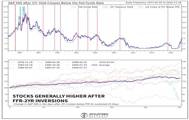 The image below shows that when the US two-year interest rate has fallen below the policy rate, the stock market usually rises by an average of 15% after 6-9 months (purple line).