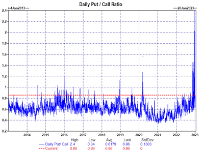 The exceptional image below shows the explosion in the purchase of put options over the past month. Not even during the financial crisis was the relationship between put options / call options as skewed as at the end of 2022. The investor collective was prepared for a sharp decline and instead 2023 has had the strongest start since 2009. This in turn creates stress for the investor collective who have a lot of cash and in many cases too defensive holdings and many have not even finished the Christmas break.