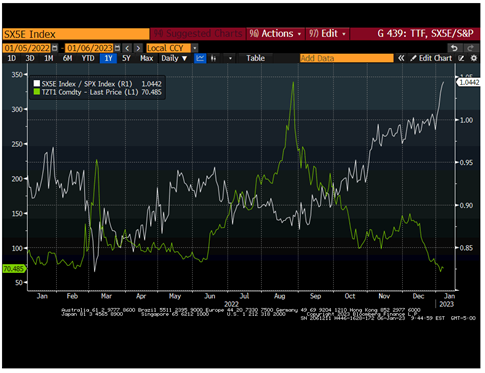 The white line below shows the relationship between the Eurostoxx and the S&P500. The green line is the price of gas. Since the start of October 2022, Eurostoxx has performed 15% better than the S&P500. At the same time, energy prices have fallen sharply.
