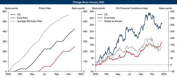 The picture below on the left shows the key interest rate for the USA and Europe and on the right the Goldman Sachs financial index where you can now see that the condition has eased somewhat in the USA.