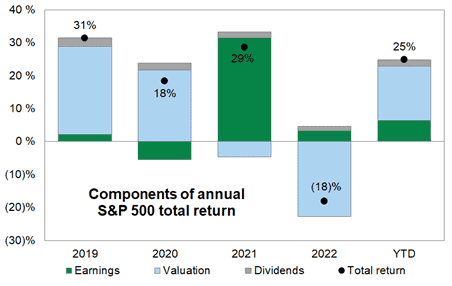 Most people have probably been surprised by the strength of the stock market in 2023. Despite a limited profit growth, the annual return was good and the biggest chunk came from an expansion in multiples. The image below shows where the returns came from in the US market.