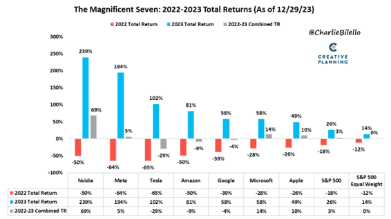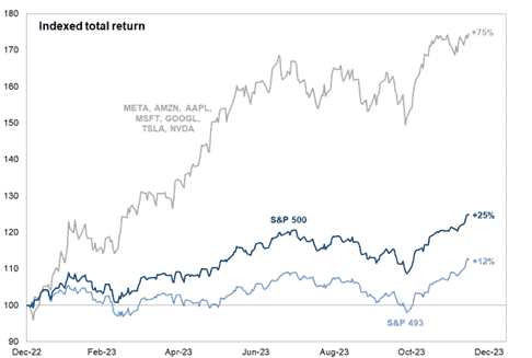 But 2023 was phenomenal for Magnificent7. A rarely seen concentration of returns from seven companies compared to the other 493 included in the S&P500.
