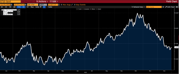 The year ended sour for most asset classes. In the FX market, the US dollar continued to weaken against the euro which is typically good for risk appetite. The Swedish krona had the opposite movement and continued its remarkable recovery, which also reflects increased risk-taking. Both of these currencies began their respective reversals in mid-October which was concurrent with the beginning of the world’s stock markets strong rally. Oil plummeted at the same time, from around $90 a barrel to $76 10 weeks later. Most notable, and the trigger for all of the above, was the US 10-year treasury note which fell from 5% to 3.87% on the last day of the year. Unbelievable!