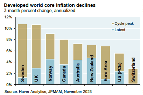 Falling prices lead to the next important picture that explains much of last year's strong performance in the stock market. In the US, we are impressed by the symbiosis between the Fed and the US economy. In Sweden, we can take our hats off to Erik Thedéen's work since he took office as Governor at the Swedish Central Bank. The starting position was grim, but most things have gone in the right direction. In most parts of the world, inflation continues to fall back and soon it is likely and hopefully close to the target levels.