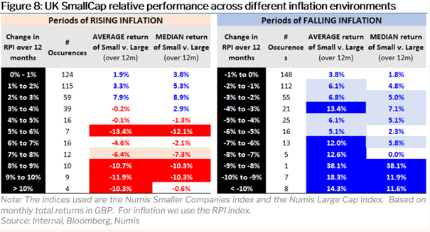 We take the liberty of copying one of last year's best images which we featured in our letter two months ago. How have smaller companies developed in different inflation scenarios? Historically very good and we are now experiencing a historic decline in inflation. We have endured 22 months of rising inflation and now know what that meant and we got a taste of the opposite in November and December.