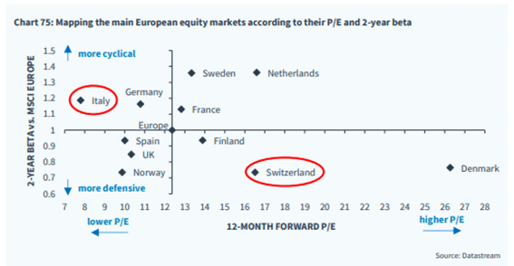Source: Goldman SachsBelow is an overview of the valuation and beta of the various European markets. Denmark stands out because of Novo Nordisk's weight in the index.