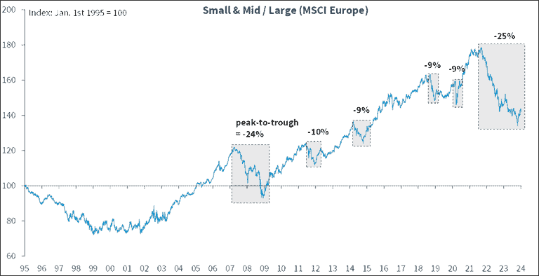 • European small caps are trading relative to larger companies at their lowest level in 20 years.