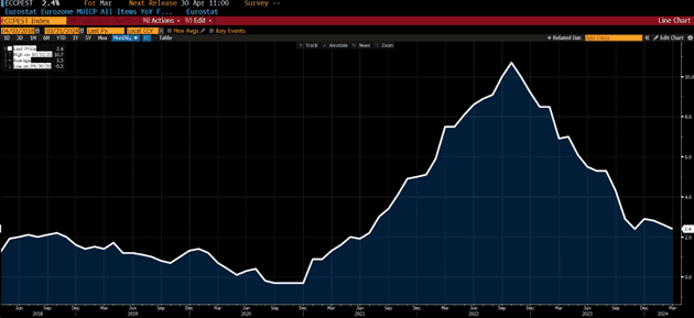 European inflation is soon fully under control. Below is Eurozone inflation including data from April 3 which showed 2.4% against an expected 2.5%. Are you awake ECB?