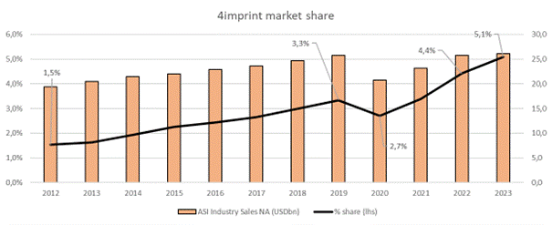 Since 2012, 4imprint has grown its sales by 15% per year, compared to 4% for the market as a whole. 2023 was another year in which the company gained market share. The strategy has been the same for many years and regardless of the economy, the company will very likely continue to gain market share. With neutral working capital and low investment requirements, the return on capital employed is very high, at over 100%.