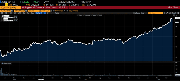 When we invested in Accelleron about 1.5 years ago in conjunction with it becoming its own public company, it was precisely the predictability that we liked and it has always been a core holding since then. Since then, the company has performed above the market's expectations while profit multiples have risen by over 50%. Overall, this has seen the share price more than double since our initial investment. Even if we do not believe in an equally strong development going forward, we believe that the share will do better than the stock market. In March, the share rose by a further 13%.