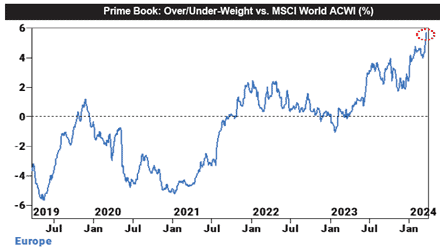 In the past month, Europe has been the most net bought region among Goldman Sachs clients. The net allocation against MSCI World was a whopping +5.8%, which was the largest deviation