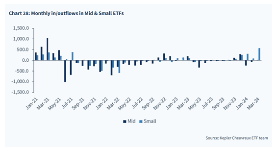 The development follows inflows to funds with a focus on small- and mid-caps (like us). Note the bar in March which showed by far the largest inflow in the last three years.